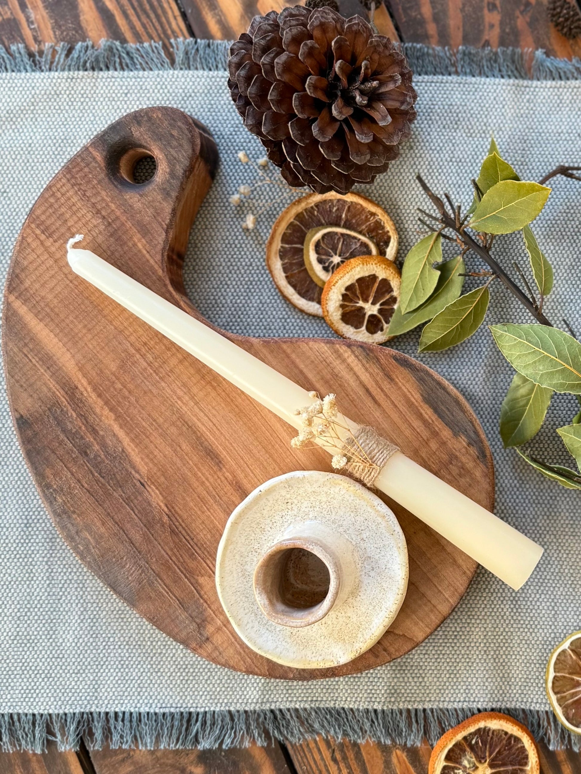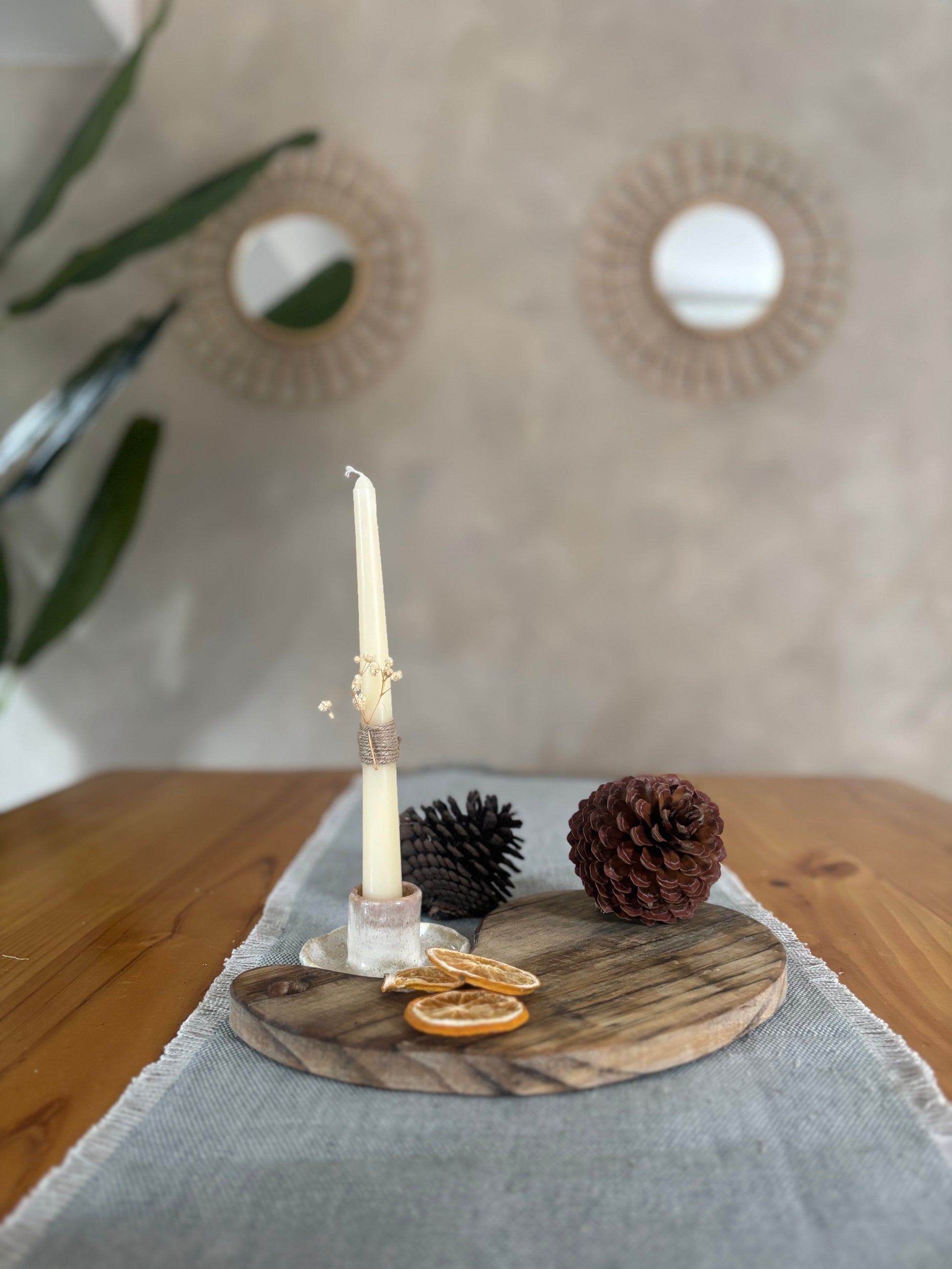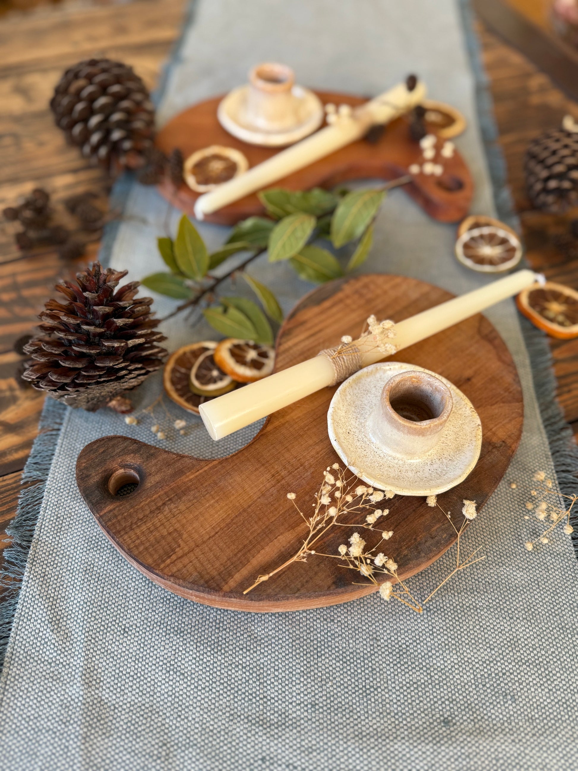 Lo que hace única a esta caja: - Camino de mesa 100% lino, confeccionado en Chile (130 cm lago x 32 cm ancho) - Tabla curva de madera rescatada (18 cm ancho x 27 cm largo total). Nota: Al ser madera recuperada, el tono varía según la madera rescatada disponible, haciendo que tu pieza sea irrepetible. - Candelabro de cerámica gres hecho a mano - Vela para iluminar tu cena.