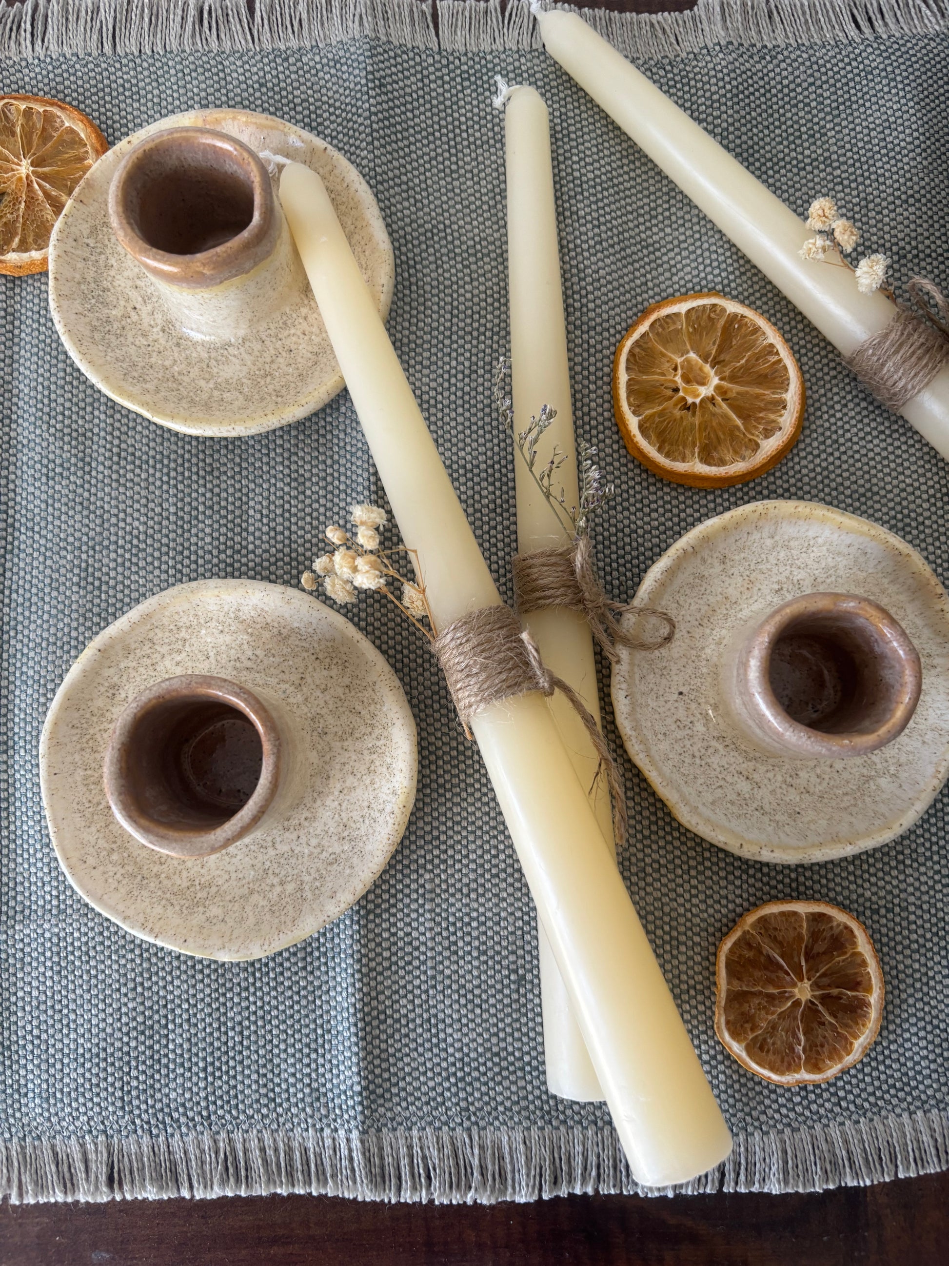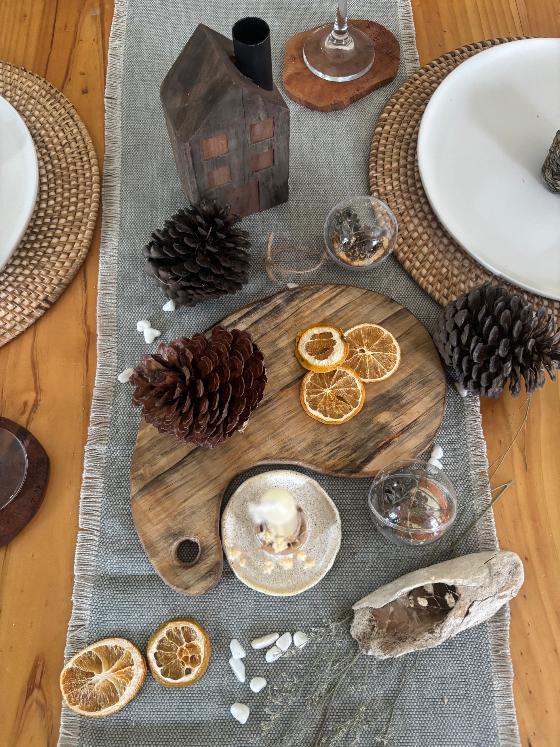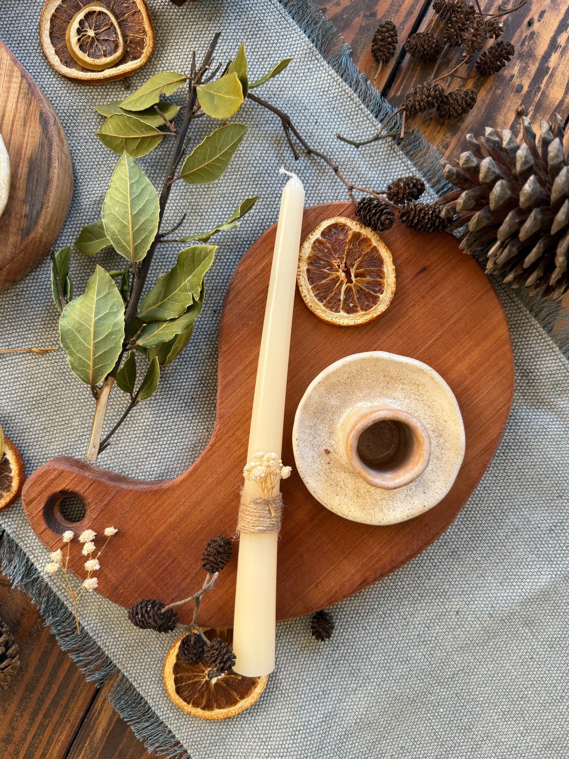 Lo que hace única a esta caja: - Camino de mesa 100% lino, confeccionado en Chile (130 cm lago x 32 cm ancho) - Tabla curva de madera rescatada (18 cm ancho x 27 cm largo total). Nota: Al ser madera recuperada, el tono varía según la madera rescatada disponible, haciendo que tu pieza sea irrepetible. - Candelabro de cerámica gres hecho a mano - Vela para iluminar tu cena.